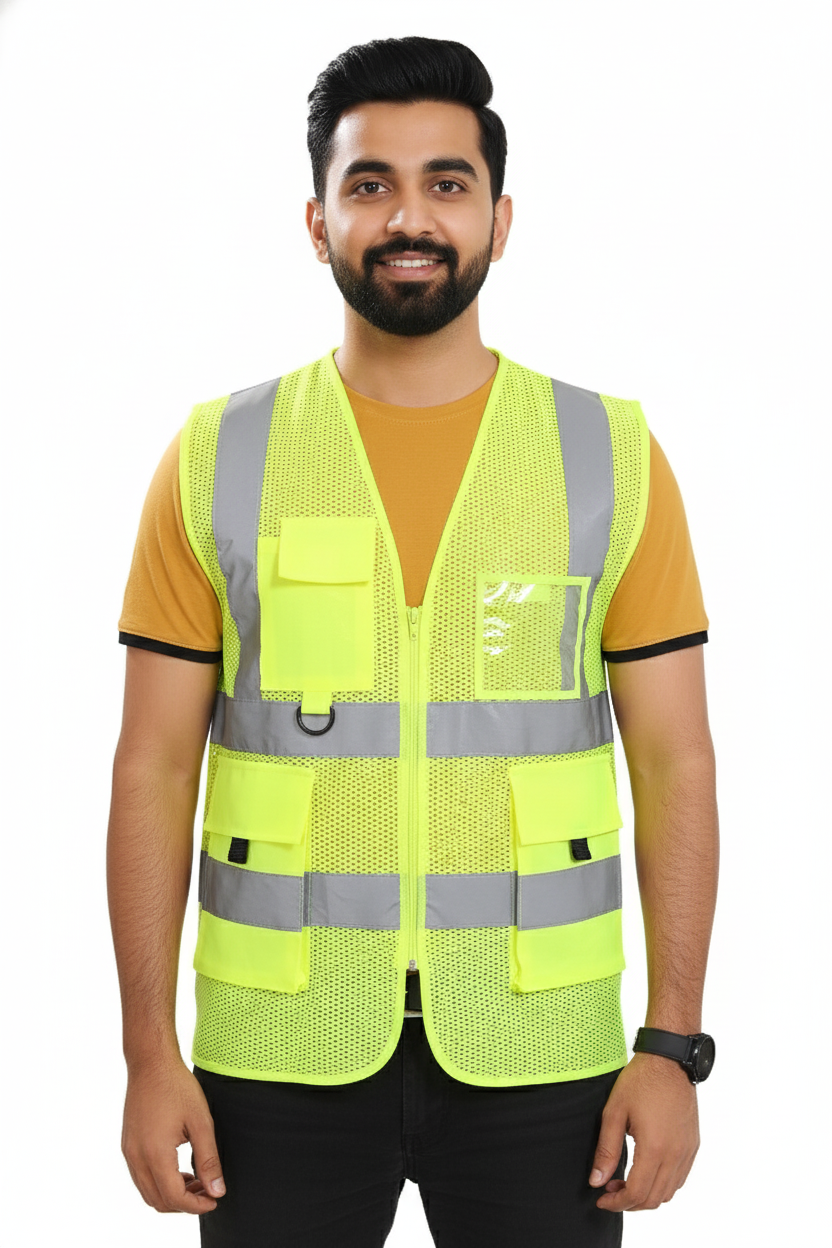 The Airport Shine Reflective Safety Jacket is engineered for high visibility and practicality, making it the ideal choice for professionals working in low-light or high-traffic environments. Featuring 300-meter visibility, this jacket ensures you stay seen in even the most challenging conditions. With a front closing zipper for easy wear, executively designed pockets, and dedicated ID and mobile pockets, it’s designed to keep your essentials safe and accessible while working in the field.